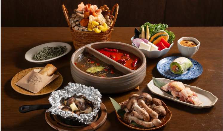 本場中華の高級な食材で、辛味の強い今までの火鍋と違い、日本のエッセンスが 入った体も心もほぐれる日本らしい火鍋のお出汁に、信州できのこ生産を営んでいる契約農家から取り寄せた最高の調味料となる珍しいきのこを使用しています。従来の火鍋とはまた違う「日式きのこ火鍋」。味わい深い昆布出汁に、それぞれ個性のあるきのこを常時10〜12種類盛り込んでご提供します。タレ場には、約20種類の薬味をご用意し、自分好みにスープやタレをアレンジできます。好きなものを、好きなように味わう。新しい火鍋の形をお楽しみください。