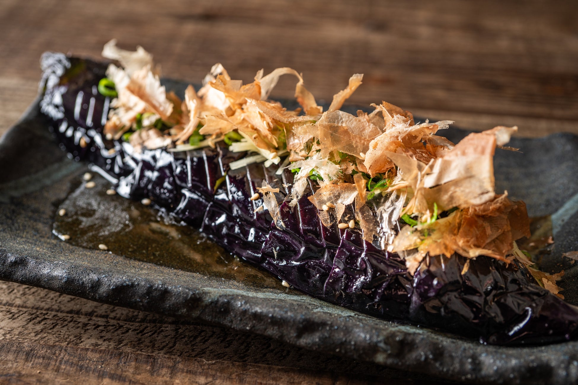 揚げ浸しというシンプルな調理法だからこそ、ナスの旨味と食感をストレートに味わえる逸品。揚げナスをだし汁に漬け込み、じっくり冷やした夏の味わい。