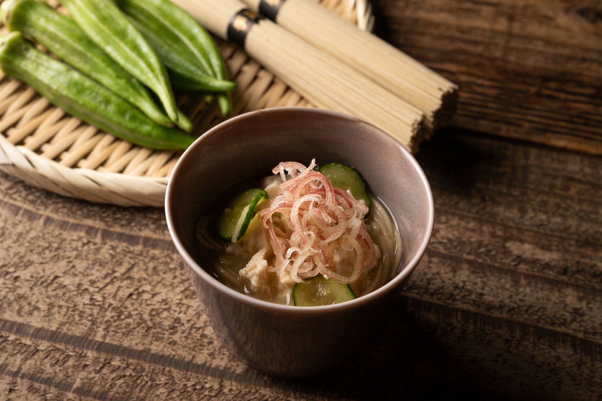 宮崎の郷土料理として知名度の高い「冷や汁」に鹿児島県指宿市の湯ノ口さんが育てたシャキシャキで粘りの強いオクラを使用。