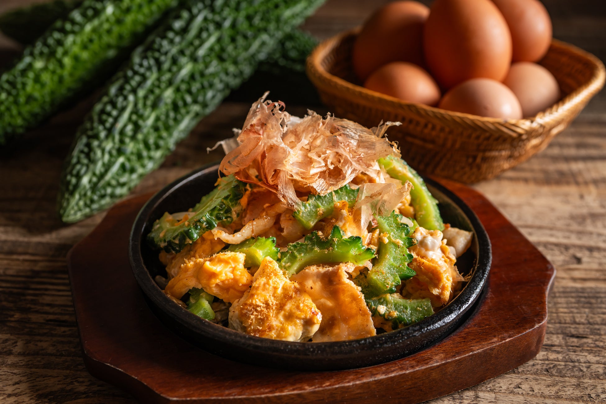 味の濃い「塚だま」、鶏油、隠し味にはじとっこスープを使い、鶏の旨味を纏ったゴーヤチャンプルーに仕上げました。