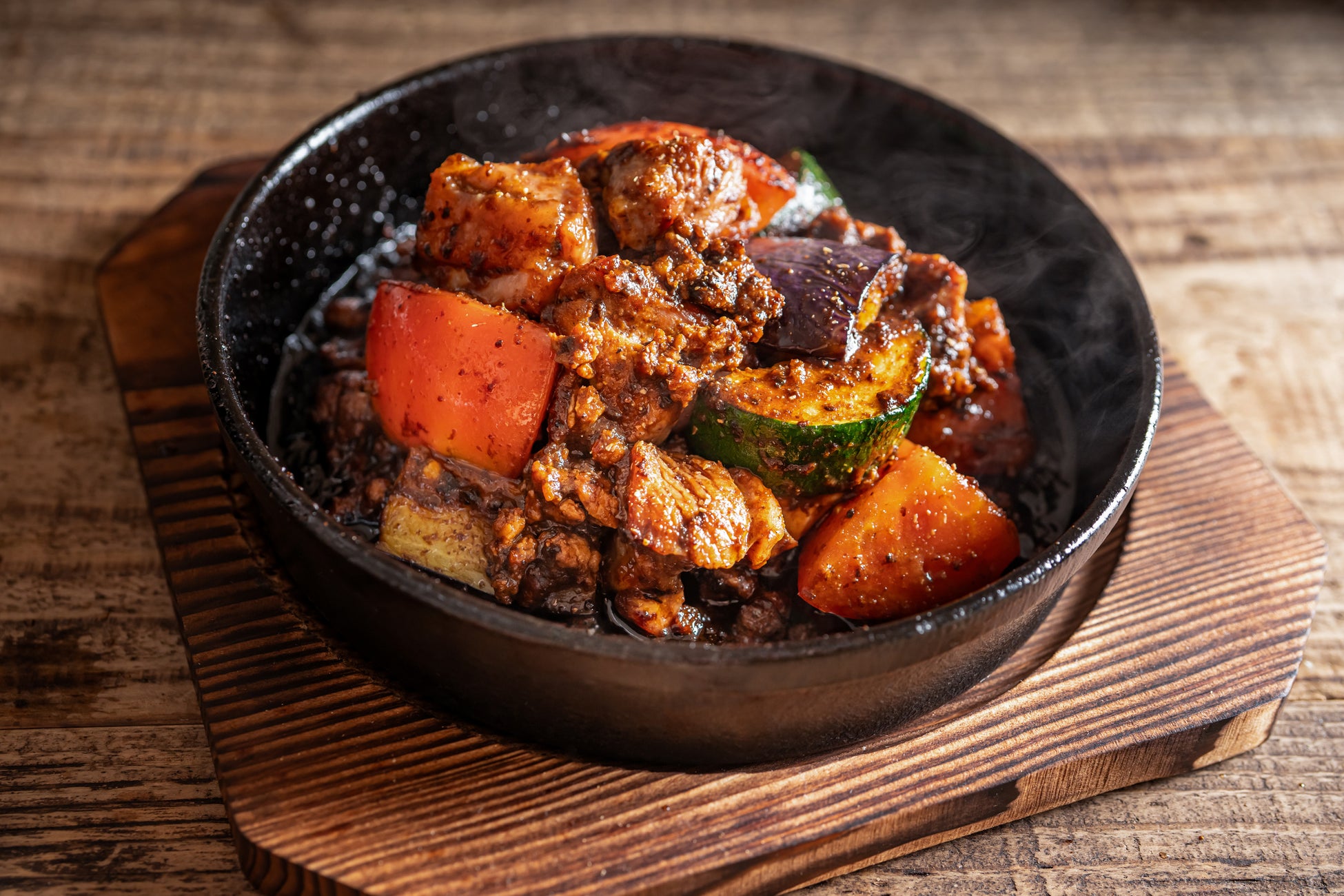この夏は宮崎県産のトマト、ズッキーニ、佐土原ナスなど、宮崎の恵まれた気候で育ったフレッシュな夏野菜と麻婆餡で絡めてスパイシーな味わいに仕上げました。