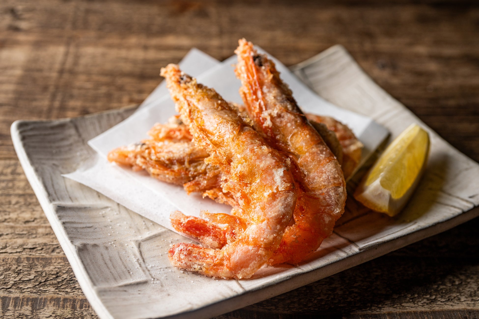 水揚げ直後の新鮮なタカエビを塚田農場のためにスピード凍結し、特別仕様に加工して届けられます。ぷりっとした食感が特徴のタカエビを殻付きのままシンプルに揚げました。