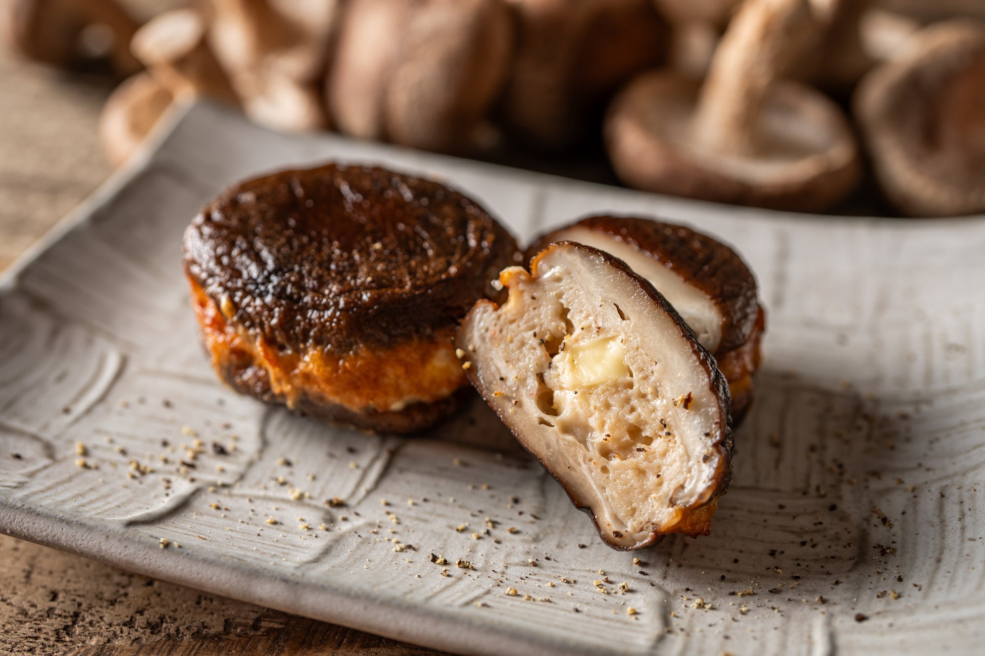 宮崎県都城市の山里で古くからの伝統を守りながら、無農薬・無肥料という貴重な環境で栽培された椎茸は肉厚で旨味が凝縮された贅沢な味わい。地鶏ベースのさつま揚げにチーズを入れて椎茸ではさみ揚げに。マカロン風のかわいらしい見た目ながら、力強い旨味を味わえます。