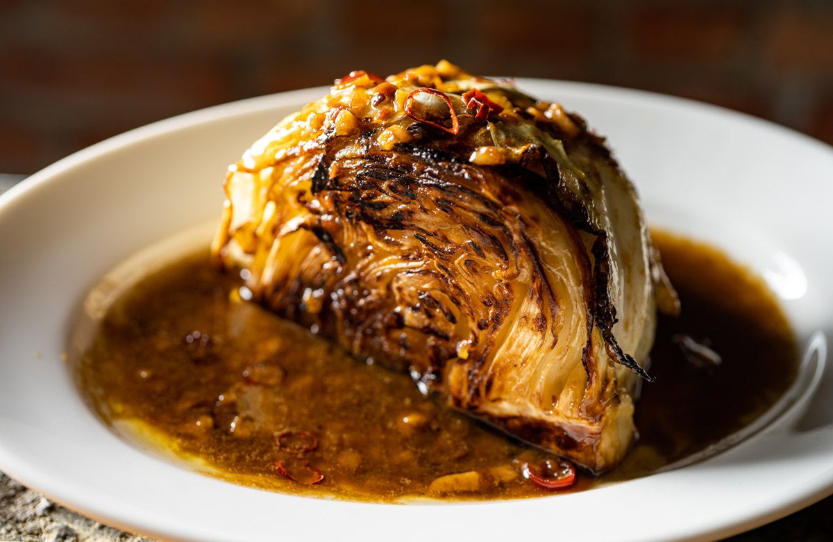 これをオーブンで焼き上げて、ニンニクが効いたアンチョビソースで召し上がっていただきます。シンプルですが、この手間暇かかったキャベツならではのおいしさがとても際立つ食べ方なのではないかと思います。