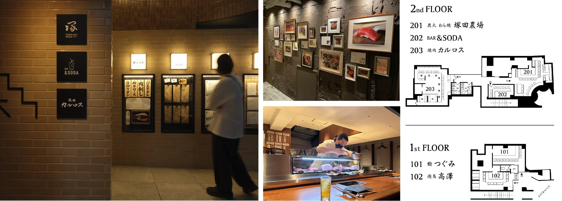 2フロア236.5㎡もの広さを用いて運営していた塚田農場1号店の跡地に「鮨 つぐみ」「焼鳥 高澤」「炭火わら焼 塚田農場」「焼肉 カルロス」「BAR & SODA」の5店舗を構えています。それぞれの職人が店主として自身の店を切り盛りし、ソムリエの館長が施設を運営しています。