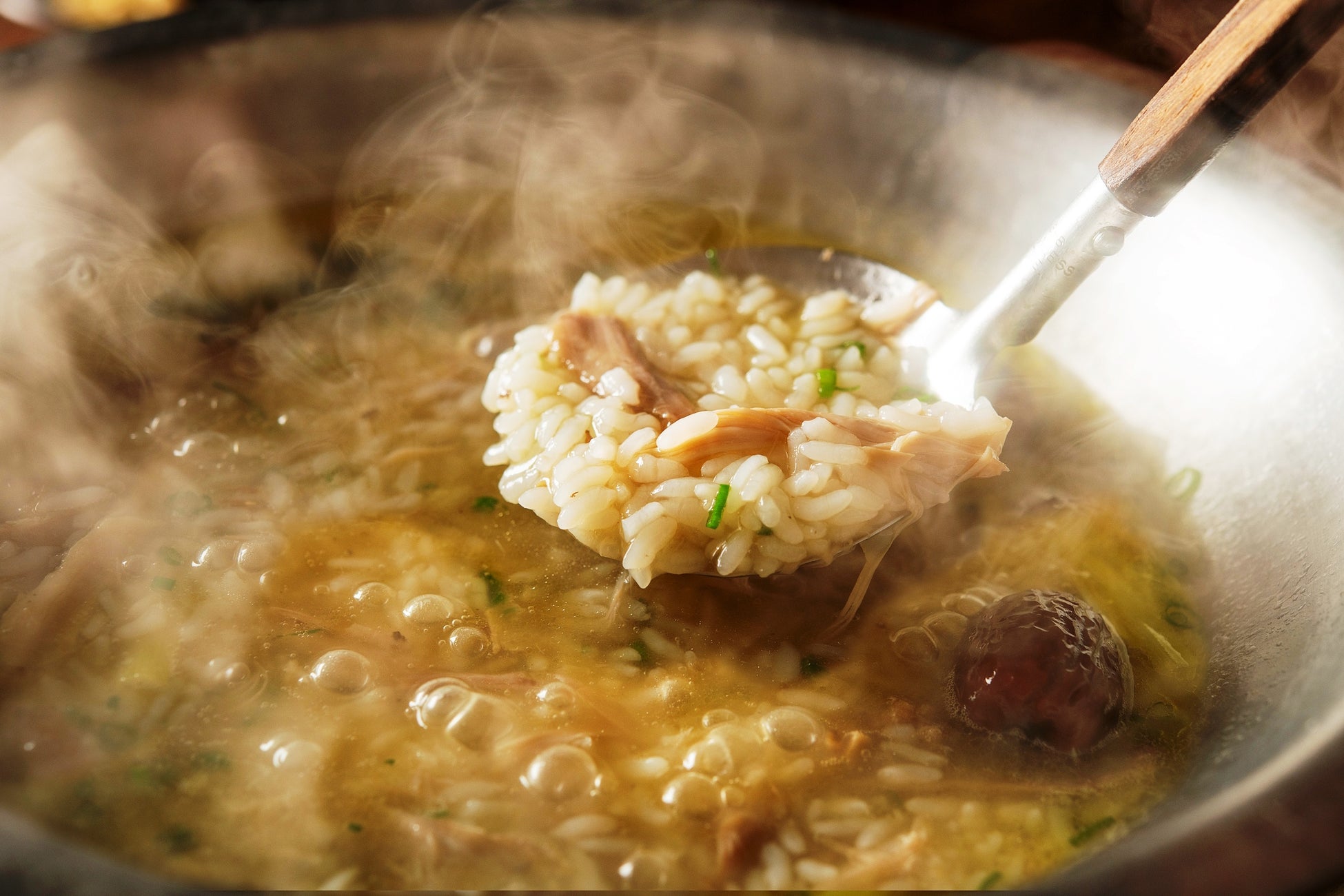 本場の作り方では腹の部分に詰めたもち米が特徴の参鶏湯。本商品では最後に残ったスープで、もち米の雑炊を作ります。