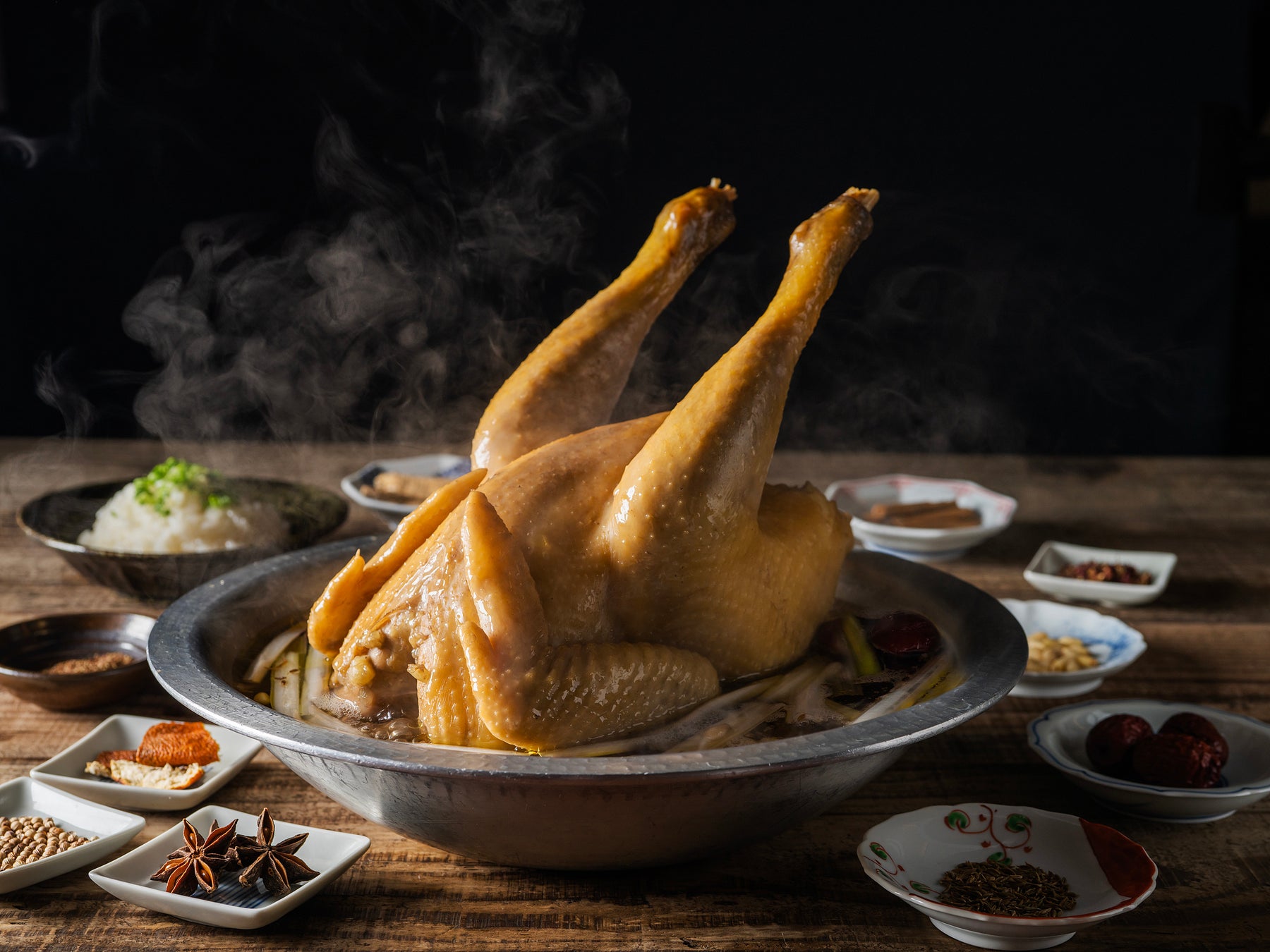 この魅力をまるごとお客様にお届けするベストな方法について、シンプルな調理で本来の旨味を味わっていただける料理とは?大きな丸鶏を飽きずに最後まで召し上がっていただける味付けは?…と追求した結果、生まれたのがこの「名物地鶏の一羽まるごと参鶏湯」です。