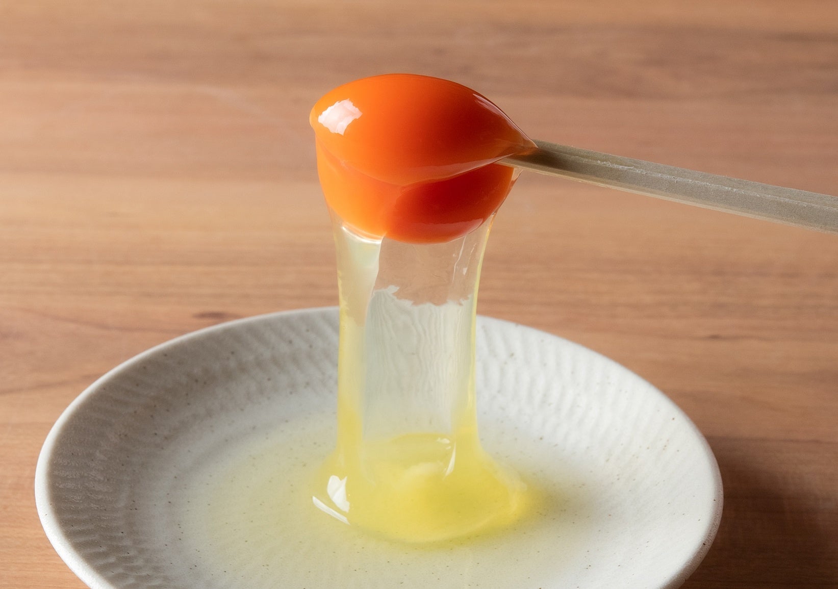 割箸で黄身を持ち上げても破れないコシや粘度は、餌や飼育環境などのこだわりとコストに捉われず良い卵を作ろうとする生産者の努力によるものです。