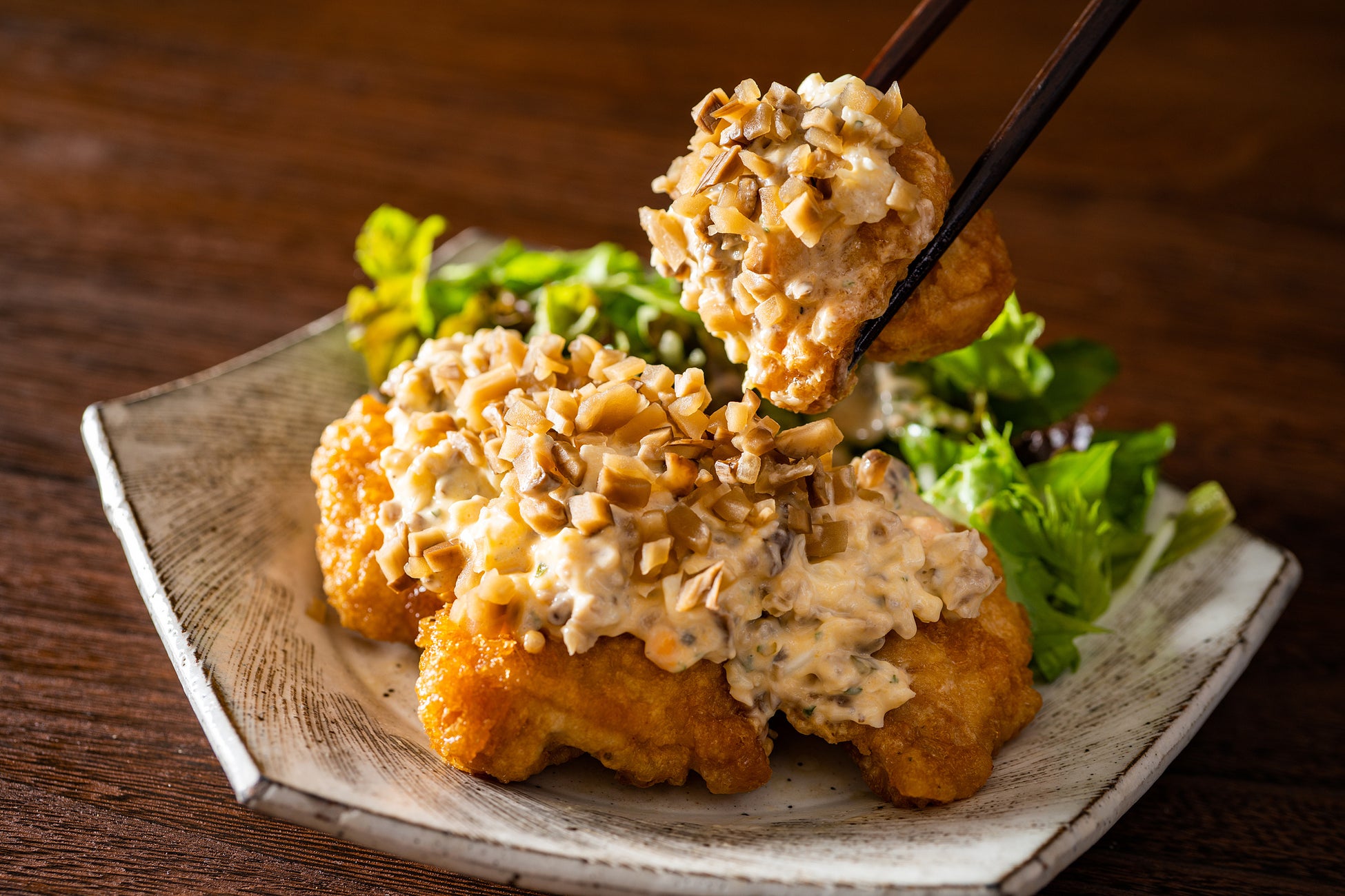 いぶりがっこの滋味と薫香は、想像する以上に塚だま®のタルタルソースとの相性が抜群で、甘酢ともよく合います。気づいたらお皿が空になっているかもしれません。