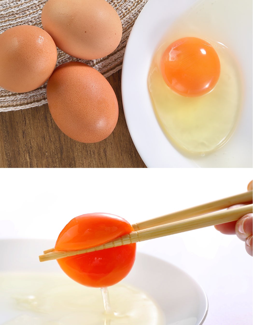 ぷっくり盛り上がってコシがある白身は、生みたてでお店に届く鮮度抜群の証。黄身は箸でつまんで持ち上げられるほどに濃厚で、コクの深い卵です。